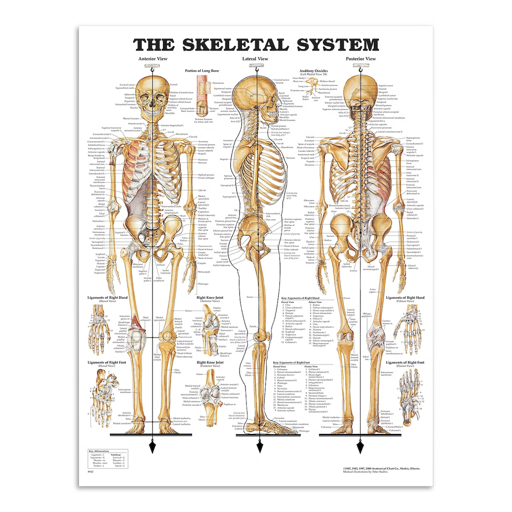 Odkryj bliższe spojrzenie na szkielet ciała z naszym plakatem ze szkieletem. Stworzony przez wybitnego artystę Petera Bachina dla Anatomical Chart Company w 1947 roku, plakat ten przetrwał próbę czasu jako jeden z najbardziej poszukiwanych i najlepiej sprzedających się plakatów anatomicznych.