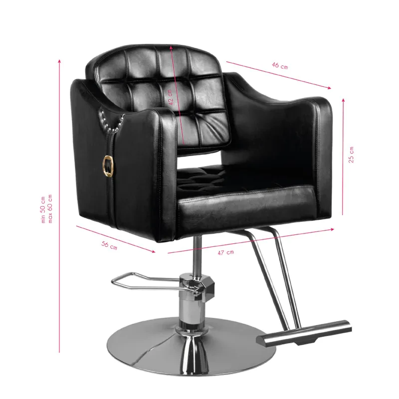 Solidna chromowana podstawa zapewnia wysoką stabilność i długą żywotność, nawet przy intensywnym użytkowaniu w salonie. Siedzisko jest obite wytrzymałą, łatwą w pielęgnacji ekoskórą w klasycznym czarnym kolorze, co nadaje mu wyrafinowany i ponadczasowy wygląd, pasujący do każdego rodzaju wnętrza salonu.