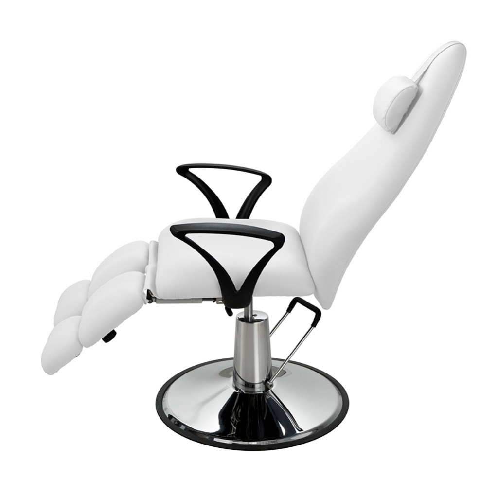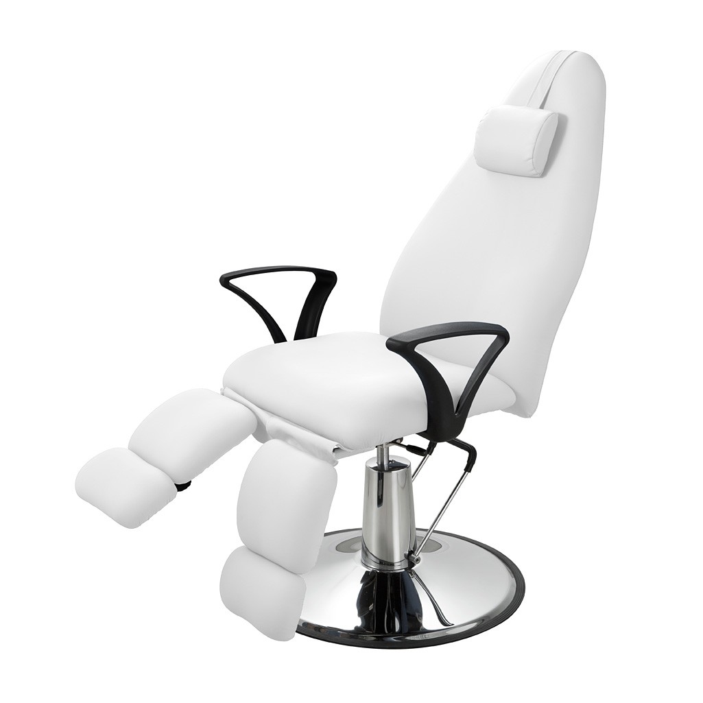 Obrotowy fotel do pedicure z bardzo stabilną chromowaną podstawą. Regulacja wysokości za pomocą pompy hydraulicznej z hamulcem. Oparcie i podnóżek regulowane bezstopniowo za pomocą sprężyny gazowej. Biała, bezszwowa tapicerka z PVC wysokiej jakości, łatwa w czyszczeniu. Zdejmowany zagłówek i poduszka.